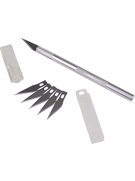 5 Interchangeable Super Sharp Blades Can be Easily Replaced. Suitable for Art and Craft and Hobbies. Package contains Detail Pen Knife Set with 5 Replacement Blades.