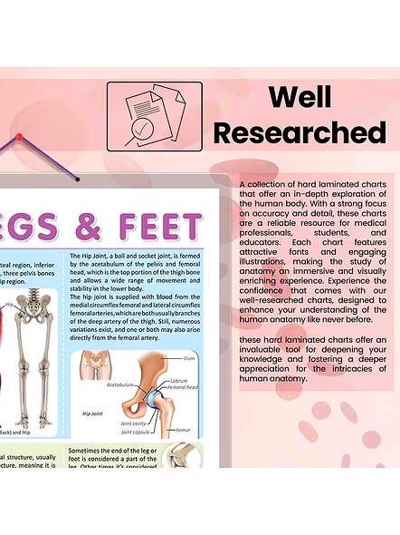 HIPS, LEGS AND FEET CHART in a 20 x 30 inches. Embark on an enlightening journey through the lower extremities with our meticulously designed chart tailored for biology students seeking an in-depth exploration. This educational masterpiece showcases the intricate structure of the hips, including the bones and ligaments that make up the hip joint. High-quality diagrams with clear labeling empower learners to comprehend the hip's complexities and its role in lower body movement and stability. Continuing its comprehensive coverage, the chart delves into the muscles of the legs, highlighting their various functions and their contribution to the body. Learners will gain a profound understanding of leg muscles' involvement in movements like walking, running, and jumping. The chart transitions to the feet and ankle, presenting the foot's unique structure and its essential role in weight-bearing and balance. Expertly drawn visuals aid students in comprehending the ankle joint's mechanics and its significance in supporting the lower body. Designed to foster interactive learning, this chart is a valuable resource for biology classrooms and self-guided study. Its comprehensive content and high-quality visuals inspire curiosity and encourage further exploration into the complexities of human lower body functions and structure.
