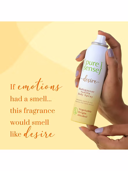 Add this to your everyday routine and envelope your senses in this subtle, delicate, warm fragrance of Madagascar Vanilla. This long-lasting aluminium free, no gas deodorant is warm & its sensual blend of aroma will make you irresistible from head to toe. This warm and seductive fragrance perfectly complements your Little black dress. This women's body spray not only elevates your outfit but also your sensuality. This is your go-to fragrance when you desire to feel alluring & irresistible all at once. This warm yet delicate fragrance is sure to delight your senses. That is not all, this luxurious body spray is long-lasting and is an instant mood changer. Made consciously, without any harmful chemicals like sulphates & parabens, this PureSense Desire Madagascar Vanilla Body Spray is gentle on your skin and pure above it all. This body spray is not tested on animals and is cruelty-free. Mesmerize yourself with its warm scent as often as desired to smell divine and pure.