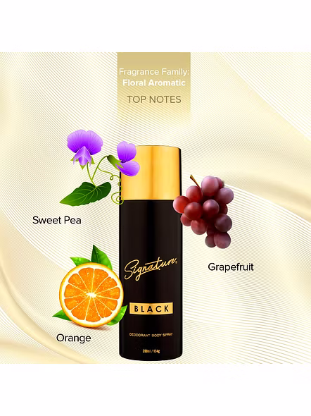 Signature Black is a male fragrance that is ideal for your assertive and powerful personality. Make an impression wherever you go by wearing this lovely scent. This flowery aromatic scent that opens with notes of Grapefruit, Orange, and Sweet Pea, melts into the heart notes of Peach, Gardenia, and Freesia before ending with notes of Patchouli, White Musk, and Leather, is perfect for your everyday wear. This deodorant, which is expertly created, lingers for hours after being applied. Made with the highest-quality ingredients, this luxurious scent is a must-have and can be used on the skin. Spray this floral aromatic scent 5 to 6 inches away from your body to stay fresh throughout the day.
