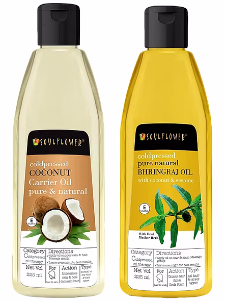 About this item ✅ SUPER NOURISHED SHINY HAIR: Deeply conditioning and hydrating, Soulflower Coconut Hair Oil is one of the most effective moisturizers you can find for your hair. ✅ HAIR LOSS PREVENTION: Coconut oil coats hair strands and keeps hair in good condition by treating hair loss causing flaky dandruff ✅ SOFT, SUPPLE SKIN: Intense hydration of Coconut Oil soothes dry skin and gives it a natural soft glow. Massaging the body with coconut oil leads to instant stress-relief. ✅🌿PREMIUM GRADE OIL: Our 💯% Pure, Cold-Pressed, Extra Virgin, Unbleached, Unfiltered & Unrefined Coconut Oil is extracted from High-Quality Coconuts which ensures you get all of its unique benefit PROMSoulflower Bhringraj Hair Oil increases circulation in the scalp and roots which activates hair follicles and increases haiFOR STRESS-RGentle massage with this cools and calms down the scalp and helps reduce stress and tension. Nutrient-rich Bhringraj reduces hair breakage and damage which makes hair roots stronger. FOR NATURALLYThis ancient, specifically formulated remedy restores and strengthens damaged hair, protects your hair from the heat of dryers, curlers, flat irons and deep conditions frizzy brittle hair.