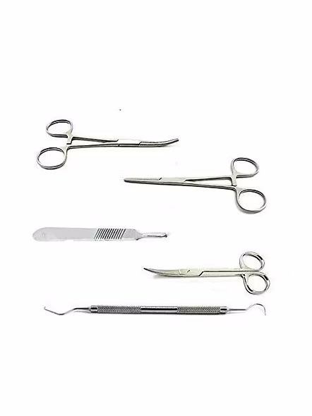 5 pcs. Surgical instrument set include : 1.pean forcep curved 14cm 2.pean forceps straight 14cm 3.scalpel handle no:3 4.iris scissor curved 5.dental probe explorer
