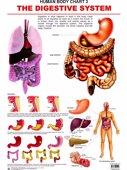 The digestive system is the system of the body that takes in, breaks down, and absorbs food and discharges solid waste and consists of the digestive tract and related glands. ‘The Digestive System’ – this wall chart features illustrations of various parts of the digestive system with all other related important information in an easy-to-read and simple-to-understand text.