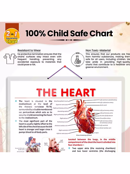THE HEART CHART in a size of 20 x 30 inches. Explore the Inner Workings of the Heart with Our Comprehensive Heart Chart: This detailed chart offers a clear visualisation of the heart's gross anatomy, complete with accurate labelling for each essential component. Uncover the intricate details of the heart's chambers, heartbeat, ventricular systole, diastole, and the cardiac cycle; all presented through high-quality diagrams. Ideal for medical students and enthusiasts alike, this chart is designed to enhance your understanding of the heart's structure and functions. This chart is made with a hard laminated surface and is easy to use best for medical students you can hang it on the wall if you are preparing for medical exams. This chart is best for those students.